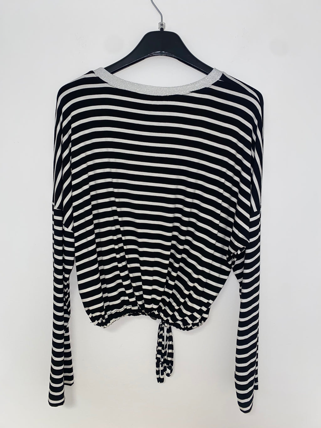 Questa maglia rigata in viscosa unisce comfort e stile grazie alla sua texture morbida e traspirante. Il laccetto regolabile sul fondo permette una vestibilità personalizzata, mentre il bordino argento aggiunge un tocco raffinato e moderno. Perfetta per chi cerca un capo versatile e di qualità, adatto sia a look casual che più curati.